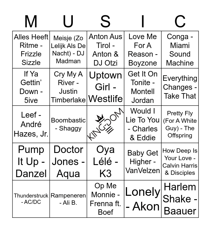This bingo card has a free space and 24 words: Doctor Jones - Aqua, Rampeneren - Ali B., Uptown Girl - Westlife, Thunderstruck - AC/DC, Conga - Miami Sound Machine, Alles Heeft Ritme - Frizzle Sizzle, If Ya Gettin’ Down - 5ive, Meisje (Zo Lelijk Als De Nacht) - DJ Madman, Would I Lie To You - Charles & Eddie, Oya Lélé - K3, Get It On Tonite - Montell Jordan, Leef - André Hazes, Jr., Baby Get Higher - VanVelzen, How Deep Is Your Love - Calvin Harris & Disciples, Cry My A River - Justin Timberlake, Lonely - Akon, Pretty Fly (For A White Guy) - The Offspring, Anton Aus Tirol - Anton & DJ Otzi, Everything Changes - Take That, Boombastic - Shaggy, Harlem Shake - Baauer, Pump It Up - Danzel, Love Me For A Reason - Boyzone and Op Me Monnie - Frenna ft. Boef.