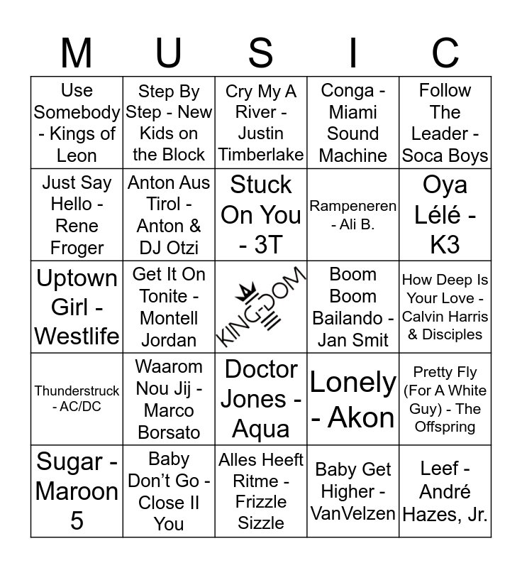 This bingo card has a free space and 24 words: Waarom Nou Jij - Marco Borsato, Baby Don’t Go - Close II You, Stuck On You - 3T, Sugar - Maroon 5, Follow The Leader - Soca Boys, Use Somebody - Kings of Leon, Just Say Hello - Rene Froger, Step By Step - New Kids on the Block, Boom Boom Bailando - Jan Smit, Doctor Jones - Aqua, Rampeneren - Ali B., Uptown Girl - Westlife, Lonely - Akon, Pretty Fly (For A White Guy) - The Offspring, Anton Aus Tirol - Anton & DJ Otzi, Baby Get Higher - VanVelzen, How Deep Is Your Love - Calvin Harris & Disciples, Cry My A River - Justin Timberlake, Oya Lélé - K3, Get It On Tonite - Montell Jordan, Leef - André Hazes, Jr., Thunderstruck - AC/DC, Conga - Miami Sound Machine and Alles Heeft Ritme - Frizzle Sizzle.