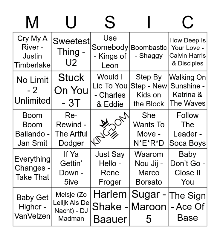 This bingo card has a free space and 24 words: If Ya Gettin’ Down - 5ive, Meisje (Zo Lelijk Als De Nacht) - DJ Madman, Would I Lie To You - Charles & Eddie, Baby Get Higher - VanVelzen, How Deep Is Your Love - Calvin Harris & Disciples, Cry My A River - Justin Timberlake, No Limit - 2 Unlimited, Sweetest Thing - U2, She Wants To Move - N*E*R*D, Just Say Hello - Rene Froger, Step By Step - New Kids on the Block, Boom Boom Bailando - Jan Smit, Waarom Nou Jij - Marco Borsato, Baby Don’t Go - Close II You, Stuck On You - 3T, Sugar - Maroon 5, Follow The Leader - Soca Boys, Use Somebody - Kings of Leon, Walking On Sunshine - Katrina & The Waves, Re-Rewind - The Artful Dodger, The Sign - Ace Of Base, Everything Changes - Take That, Boombastic - Shaggy and Harlem Shake - Baauer.