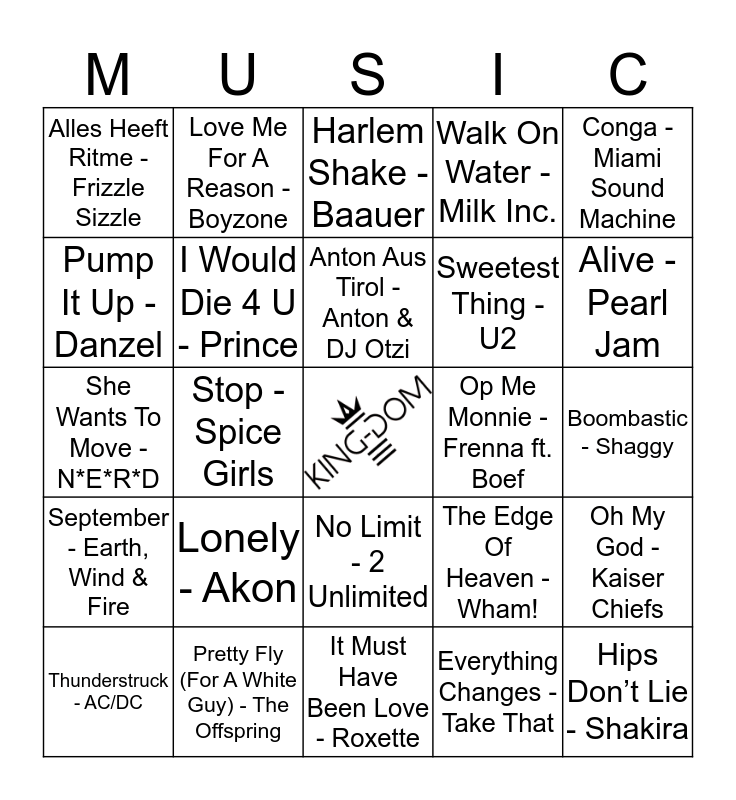 This bingo card has a free space and 24 words: Lonely - Akon, Pretty Fly (For A White Guy) - The Offspring, Anton Aus Tirol - Anton & DJ Otzi, Thunderstruck - AC/DC, Conga - Miami Sound Machine, Alles Heeft Ritme - Frizzle Sizzle, Pump It Up - Danzel, Love Me For A Reason - Boyzone, Op Me Monnie - Frenna ft. Boef, No Limit - 2 Unlimited, Sweetest Thing - U2, She Wants To Move - N*E*R*D, The Edge Of Heaven - Wham!, Oh My God - Kaiser Chiefs, I Would Die 4 U - Prince, Everything Changes - Take That, Boombastic - Shaggy, Harlem Shake - Baauer, Alive - Pearl Jam, Stop - Spice Girls, Hips Don’t Lie - Shakira, September - Earth, Wind & Fire, Walk On Water - Milk Inc. and It Must Have Been Love - Roxette.