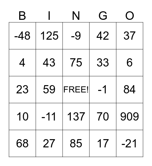 This bingo card has a free space and 41 words: 14, 23, 19, 43, 27, 137, 75, 21, 37, 10, 59, 42, -21, 84, -1, -11, 47, -48, -3, -9, 909, 490, 85, 33, 49, 28, 17, 32, 6, 0, 12, 125, 68, 36, 70, 4, -42, -61, -69, 14 and 30.