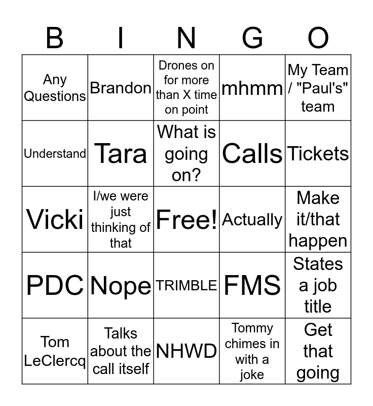 This bingo card has a free space and 39 words: States a job title, Madison, Jess, Tara, Tom LeClercq, TRIMBLE, What is going on?, Anything Else, My Team / "Paul's" team, PDC, I/we were just thinking of that, mhmm, Get that going, Make it/that happen, Actually, Nope, So, Any Questions, STL, FMS, Understand, NHWD, Calls, Tickets, Support, Cherwell, WTL/ "the west", Inappropriately agrees to whatever was asked, Overcommits FMS Support Team, Brandon, Awkward dispute, Dodges PDC backlog, Drones on for more than X time on point, Talks about the call itself, Tommy chimes in with a joke, Misrepresents understanding, States a job title, Vicki and Release.