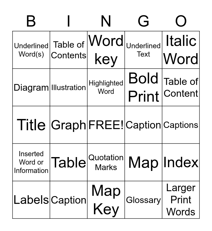 This bingo card has a free space and 24 words: Table, Caption, Highlighted Word, Labels, Italic Word, Underlined Word(s), Diagram, Table of Contents, Caption, Quotation Marks, Bold Print, Title, Map, Index, Illustration, Glossary, Captions, Word key, Table of Content, Graph, Larger Print Words, Inserted Word or Information, Underlined Text and Map Key.