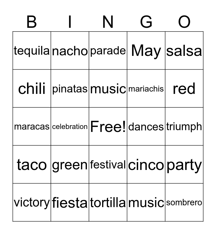 This bingo card has a free space and 24 words: green, fiesta, music, victory, salsa, tequila, chili, nacho, dances, festival, mariachis, maracas, cinco, party, pinatas, music, triumph, parade, red, celebration, sombrero, taco, May and tortilla.