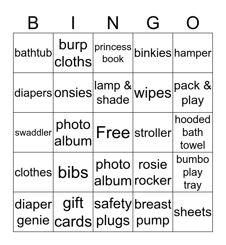 This bingo card has a free space and 24 words: bibs, gift cards, lamp & shade, diaper genie, hamper, bathtub, diapers, burp cloths, stroller, photo album, wipes, swaddler, rosie rocker, bumbo play tray, onsies, breast pump, hooded bath towel, princess book, pack & play, photo album, sheets, clothes, binkies and safety plugs.