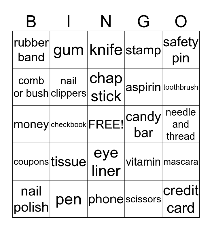 This bingo card has a free space and 24 words: tissue, pen, chap stick, nail polish, safety pin, rubber band, comb or bush, gum, candy bar, eye liner, aspirin, money, vitamin, mascara, nail clippers, scissors, needle and thread, knife, toothbrush, checkbook, credit card, coupons, stamp and phone.