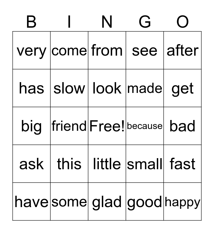 This bingo card has a free space and 24 words: this, some, look, have, after, very, has, come, because, little, made, big, small, fast, slow, good, bad, from, get, friend, happy, ask, see and glad.