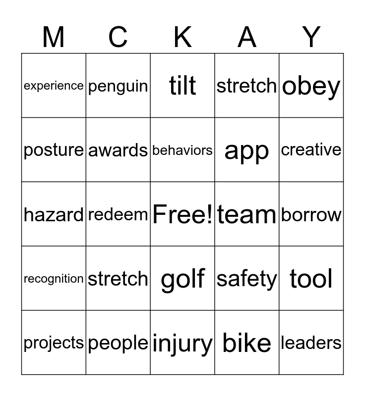This bingo card has a free space and 24 words: stretch, people, behaviors, projects, obey, experience, posture, penguin, team, golf, app, hazard, safety, tool, awards, bike, borrow, tilt, creative, redeem, leaders, recognition, stretch and injury.