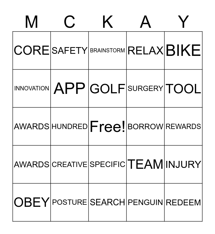 This bingo card has a free space and 24 words: CREATIVE, POSTURE, GOLF, OBEY, BIKE, CORE, INNOVATION, SAFETY, BORROW, SPECIFIC, SURGERY, AWARDS, TEAM, INJURY, APP, PENGUIN, REWARDS, BRAINSTORM, TOOL, HUNDRED, REDEEM, AWARDS, RELAX and SEARCH.
