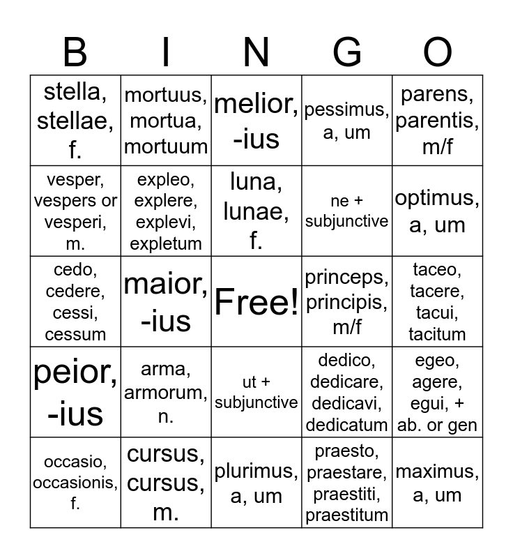 This bingo card has a free space and 24 words: arma, armorum, n., cursus, cursus, m., luna, lunae, f., occasio, occasionis, f., parens, parentis, m/f, stella, stellae, f., vesper, vespers or vesperi, m., mortuus, mortua, mortuum, princeps, principis, m/f, ut + subjunctive, ne + subjunctive, cedo, cedere, cessi, cessum, dedico, dedicare, dedicavi, dedicatum, egeo, agere, egui, + ab. or gen, expleo, explere, explevi, expletum, praesto, praestare, praestiti, praestitum, taceo, tacere, tacui, tacitum, melior, -ius, optimus, a, um, maior, -ius, maximus, a, um, peior, -ius, pessimus, a, um and plurimus, a, um.