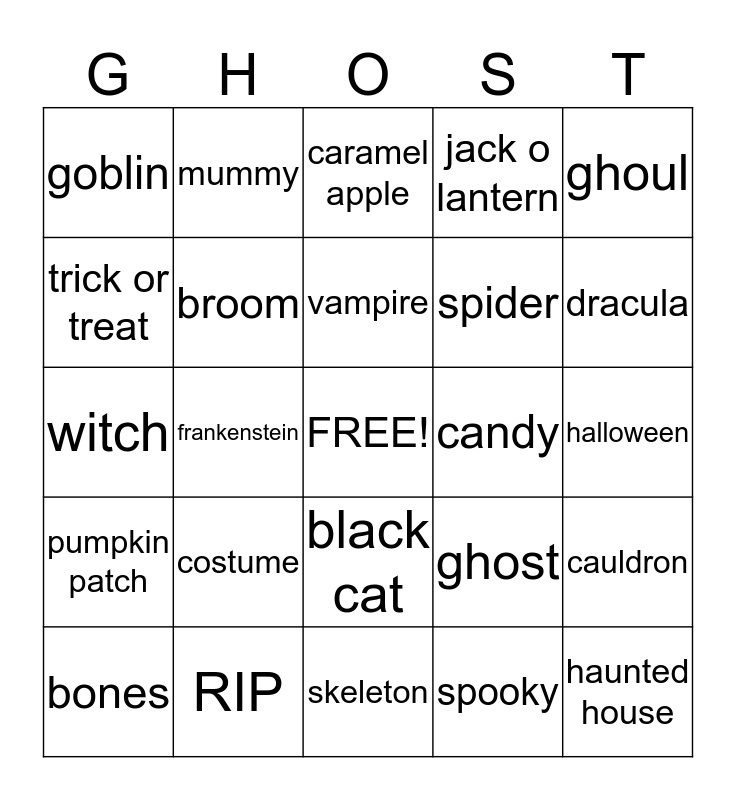 This bingo card has a free space and 24 words: costume, RIP, vampire, bones, ghoul, goblin, trick or treat, mummy, candy, black cat, spider, witch, ghost, cauldron, broom, spooky, halloween, caramel apple, dracula, frankenstein, haunted house, pumpkin patch, jack o lantern and skeleton.