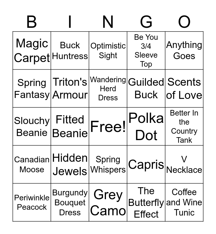 This bingo card has a free space and 130 words: Solid, Buck Huntress, Dreamcatcher, O Canada, 3/4 Sleeve Dolman, Day Of The Dead, Canadian Moose, Beaver Fever, Darling, Northern Wildlife, Rainbow Snowflake, Headbands, Fantastic Fox, Denim Jeggings, Reindeer, Fuschia Camo, Grey Camo, Starter Pack, Sharkbite Tunic, You Are My Rein"Dear", Let the Beat Drop, Guilded Buck, Olive Camo, Secret Garden, Be-You-Tiful Tunic, Leg Warmers, Coffee and Wine Tunic, Cuddle Weather Cardigan, Multipurpose Bandana, Dog Momma Tank Top, Slouchy Beanie, Fitted Beanie, Floral Sleeve Top, Sassy Cardigan, 30 inch Chain, Cat Mama Tank, Tan Camo, Infinity Scarf, Button Scarf, DN Charm, Polka Dot, Du North, Imaginary Flight, Catching Dreams, Wild Ride, Sassy Solid Wine Cardigan, Rose Gold Scent Pod, Hidden Jewels, Anything Goes, Capris, Leggings, Periwinkle Peacock, Shock Factor, Let's Mandalay On The Beach, Maxi Skirt, Charm Bracelet, Designed By Sunrise, Circus Act, Miss Independant, Wifey Tank, Summer Fling, Holy Darkness, Summer Shivers, Enchanted Garden, Mystified, Magic Carpet, Staycation, Deep Sea Mystery, Scents of Love, Spring Fantasy, Simply Floral, Better In the Country Tank, Voulez-Vous, Charming Chevron, They Blood At Night, A Touch of Magic, Synchronized Orchastrations, Mommy and Me, A wish Away, Pineapple Tank, The Butterfly Effect, Anything Goes, Bubblegum Blast, My Way, Wandering Herd Dress, Midnight Owl Tank, Burgundy Bouquet Dress, Brilliant Ideas, Flamingo Lingo, Metal Meow Tank, Cotton Candy Creations, Watch, Spring Whispers, Espresso Yourself Tank, Inspire Top, Spring Tease, I See Fireworks, Optimistic Sight, Triton's Armour, Horseshoe Necklace, Fatal Beauty, Sunny Disposition, Be You 3/4 Sleeve Top, Tropical Tease Maxi Dress, Crochet Elephant Tank, Splitting Arrows, V Necklace, Fanciful Dress, Wind Over Water, Diamond Daises, Better Dogs Tank, Rock and Roll Tank, Sun Necklace, Bombshell Tank, They Whine Tank, On the Prowl Maxi Dress, Sea Connections, Hologram Maxi Dress, Never Trust Tank, Cupids Arrow Necklace, Bangles, Tree Necklace, Burning Up, Blankey Scarf, McLennan, Alberta, Krystina Dubrule, Empowerment, Walk Du North and Starter Packs.