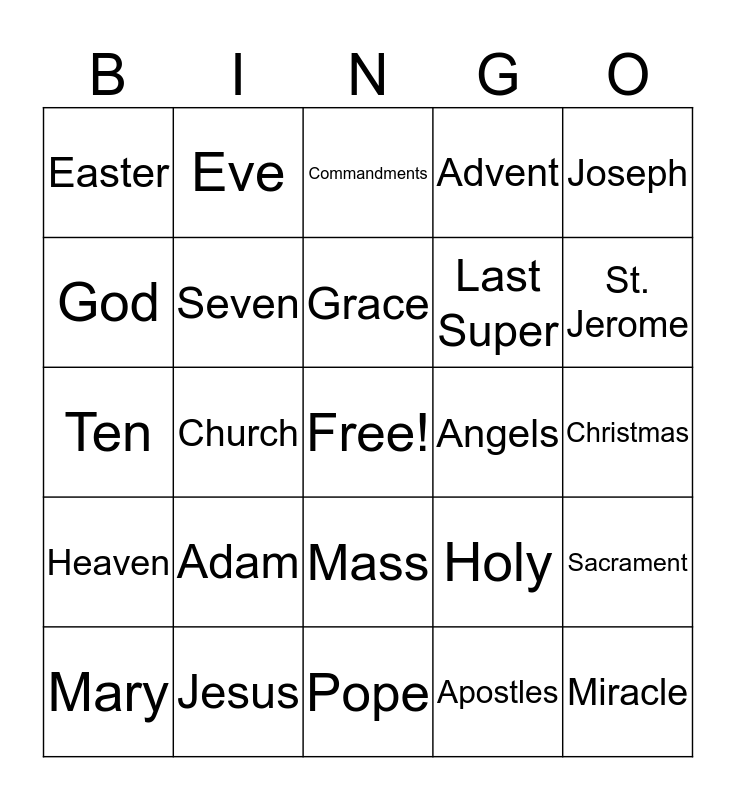 This bingo card has a free space and 24 words: Adam, Jesus, Grace, Mary, Joseph, Easter, God, Eve, Angels, Mass, Last Super, Ten, Holy, Sacrament, Seven, Apostles, Christmas, Commandments, St. Jerome, Church, Miracle, Heaven, Advent and Pope.