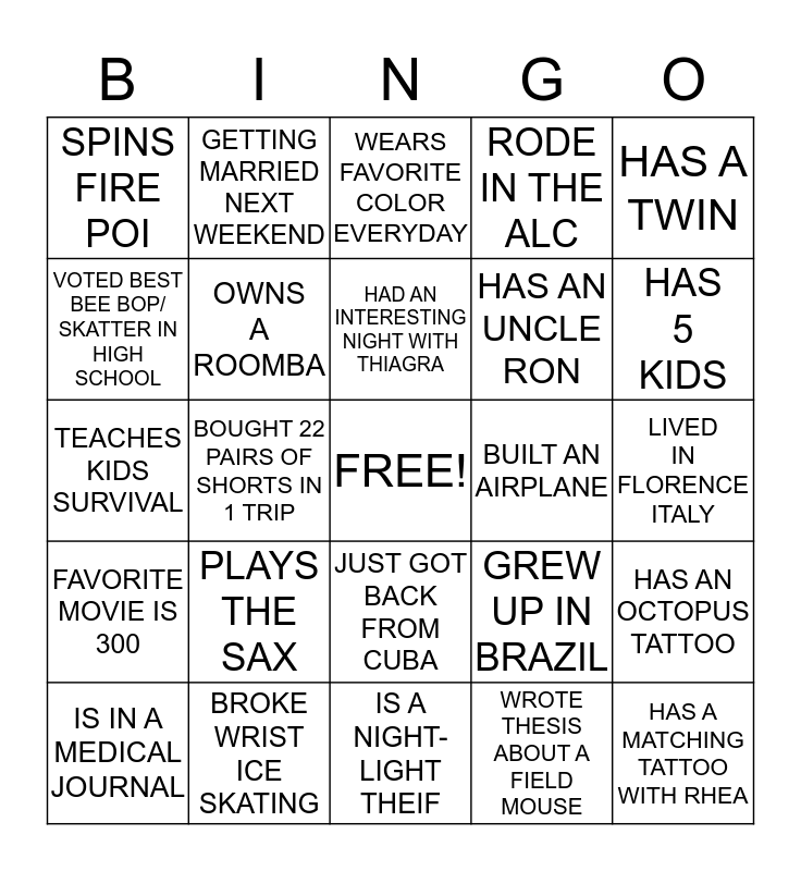 This bingo card has a free space and 24 words: PLAYS THE SAX, BROKE WRIST ICE SKATING, HAD AN INTERESTING NIGHT WITH THIAGRA, IS IN A MEDICAL JOURNAL, HAS A TWIN, SPINS FIRE POI, VOTED BEST BEE BOP/ SKATTER IN HIGH SCHOOL, GETTING MARRIED NEXT WEEKEND, BUILT AN AIRPLANE, JUST GOT BACK FROM CUBA, HAS AN UNCLE RON, TEACHES KIDS SURVIVAL, GREW UP IN BRAZIL, HAS AN OCTOPUS TATTOO, OWNS A ROOMBA, WROTE THESIS ABOUT A FIELD MOUSE, LIVED IN FLORENCE ITALY, WEARS FAVORITE COLOR EVERYDAY, HAS 5 KIDS, BOUGHT 22 PAIRS OF SHORTS IN 1 TRIP, HAS A MATCHING TATTOO WITH RHEA, FAVORITE MOVIE IS 300, RODE IN THE ALC and IS A NIGHT-LIGHT THEIF.