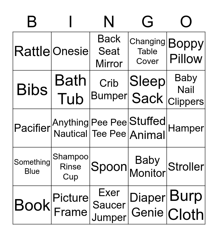 This bingo card has a free space and 24 words: Shampoo Rinse Cup, Picture Frame, Crib Bumper, Book, Boppy Pillow, Rattle, Bibs, Onesie, Stuffed Animal, Spoon, Sleep Sack, Pacifier, Baby Monitor, Stroller, Bath Tub, Diaper Genie, Hamper, Back Seat Mirror, Baby Nail Clippers, Anything Nautical, Burp Cloth, Something Blue, Changing Table Cover and Exer Saucer Jumper.