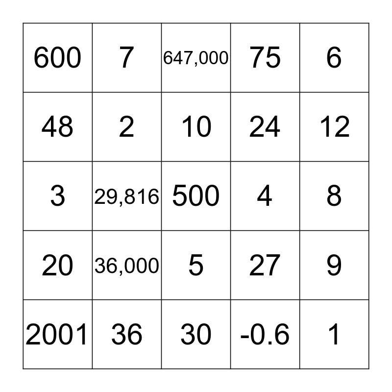 This bingo card has 25 words: 36,000, 30, 10, 2001, 6, 600, 48, 7, 4, 5, 24, 3, 27, 9, 2, 1, 8, 647,000, 12, 29,816, 500, 36, 20, 75 and -0.6.