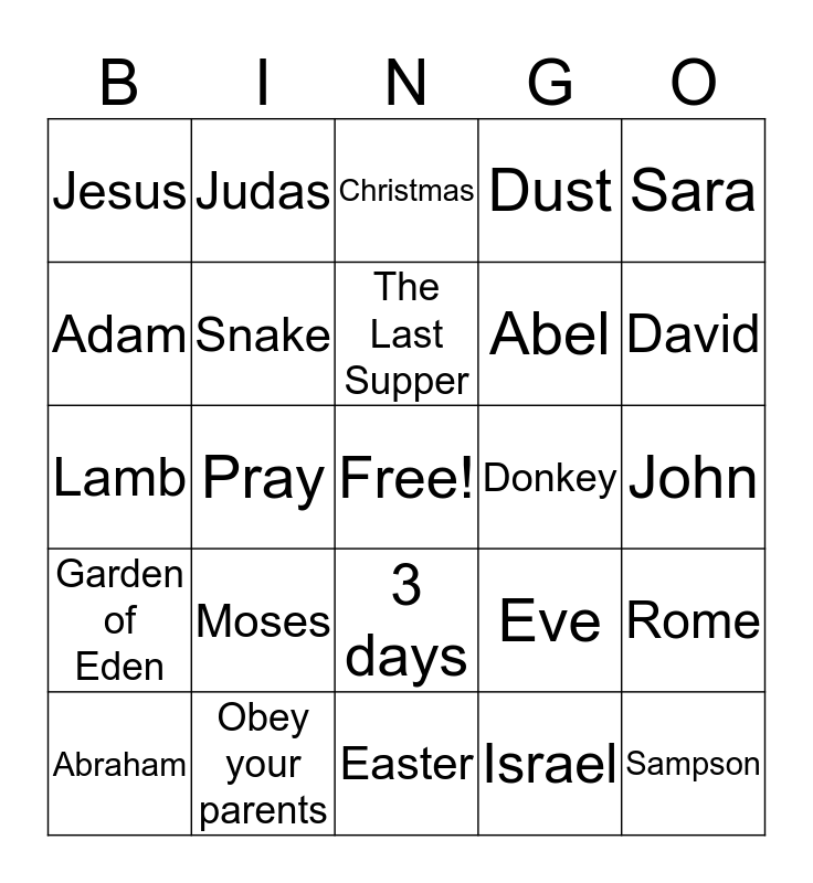 This bingo card has a free space and 24 words: Abraham, Moses, The Last Supper, Israel, Sara, Jesus, Judas, Christmas, Donkey, John, Lamb, Snake, Eve, Rome, Adam, Obey your parents, Easter, Dust, David, Garden of Eden, Pray, 3 days, Abel and Sampson.