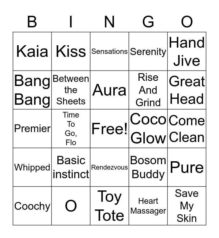 This bingo card has a free space and 34 words: Like a Virgin, Heart Massager, Afterglow, Skinny Dip, Whipped, Between the Sheets, Hand Jive, Coochy, Kiss, Just Like Me, Aura, Sensations, Miracle Oikl, Body Boost, Coco Glow, Great Head, O, Premier, Basic instinct, Bosom Buddy, Rendezvous, Body Dew, Kaia, Come Clean, Toy Tote, Save My Skin, Serenity, Pure Pleasure, Rise And Grind, Bang Bang, Open Sesame, Time To Go, Flo, Pure and Booty Eaze.
