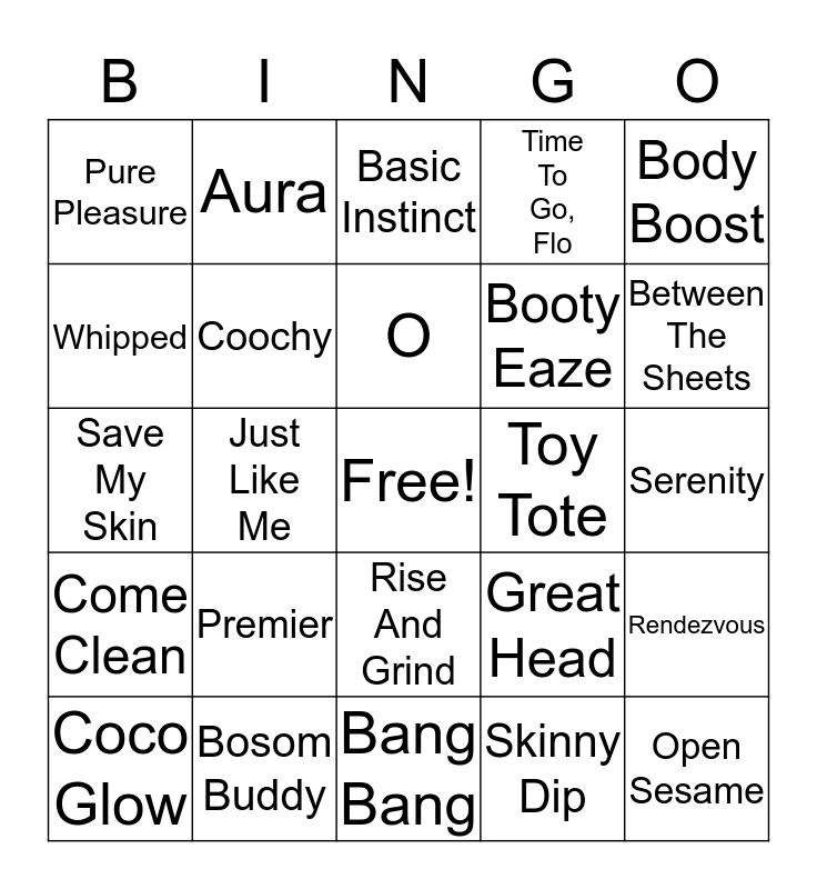 This bingo card has a free space and 34 words: Kiss, Skinny Dip, Heart Massager, Kaia, Come Clean, Coochy, Body Boost, Coco Glow, Aura, Afterglow, O, Basic Instinct, Like A Virgin, Booty Eaze, Toy Tote, Between The Sheets, Bosom Buddy, Save My Skin, Premier, Great Head, Rise And Grind, Sensations, Pure Pleasure, Serenity, Bang Bang, Open Sesame, Time To Go, Flo, Pure, Booty Eaze, Whipped, Hand Jive, Just Like Me, Rendezvous and Body Dew.