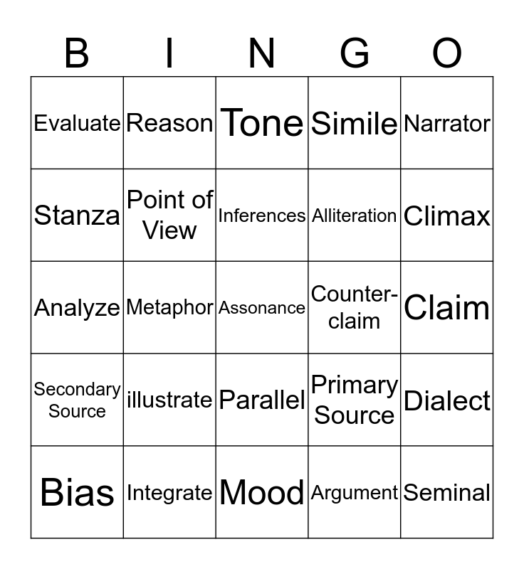 This bingo card has 30 words: Integrate, Explicit, Metaphor, Summarize, Evaluate, Tone, Point of View, Parallel, Counter-claim, Mood, Claim, Assonance, Argument, Seminal, Climax, Cite, Primary Source, Secondary Source, illustrate, Narrator, Analyze, Context, Reason, Alliteration, Stanza, Simile, Dialect, Bias, Inferences and Personification.