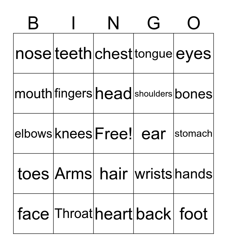 This bingo card has a free space and 24 words: Arms, Throat, head, face, eyes, nose, mouth, teeth, ear, hair, shoulders, elbows, wrists, hands, fingers, back, stomach, chest, bones, knees, foot, toes, tongue and heart.
