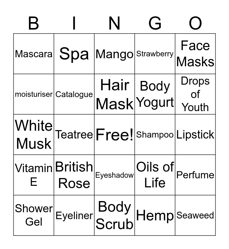 This bingo card has a free space and 29 words: Aloe Vera, Eyeliner, Mango, Satsuma, Face Masks, Mascara, Catalogue, Hair Mask, Shampoo, Perfume, Shower Gel, Teatree, Hemp, Seaweed, White Musk, Bath lily, Body Scrub, Oils of Life, Drops of Youth, Vitamin E, British Rose, Face Mist, Body Yogurt, Lipstick, moisturiser, Spa, Eyeshadow, Strawberry and Toner.