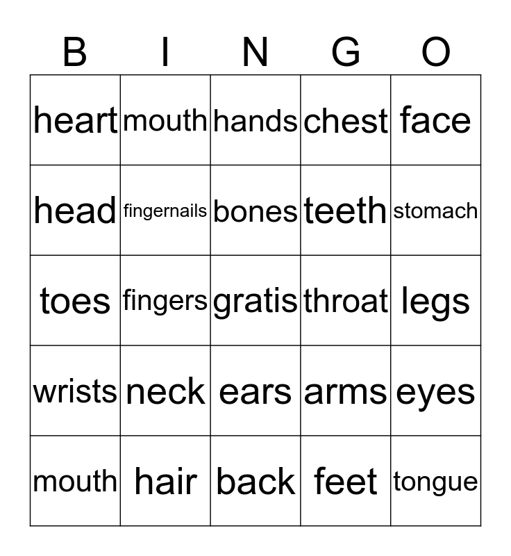 This bingo card has a free space and 24 words: neck, hair, bones, mouth, face, heart, head, mouth, throat, ears, teeth, toes, arms, eyes, fingernails, feet, legs, hands, stomach, fingers, tongue, wrists, chest and back.