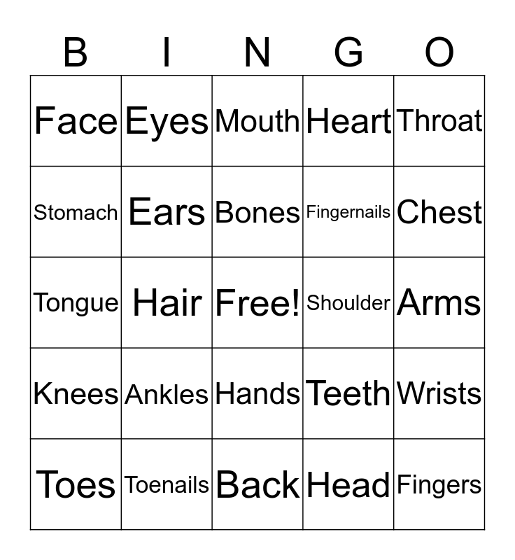 This bingo card has a free space and 24 words: Toes, Ankles, Bones, Head, Throat, Face, Eyes, Mouth, Shoulder, Arms, Tongue, Ears, Teeth, Wrists, Stomach, Toenails, Back, Heart, Chest, Knees, Hair, Hands, Fingernails and Fingers.