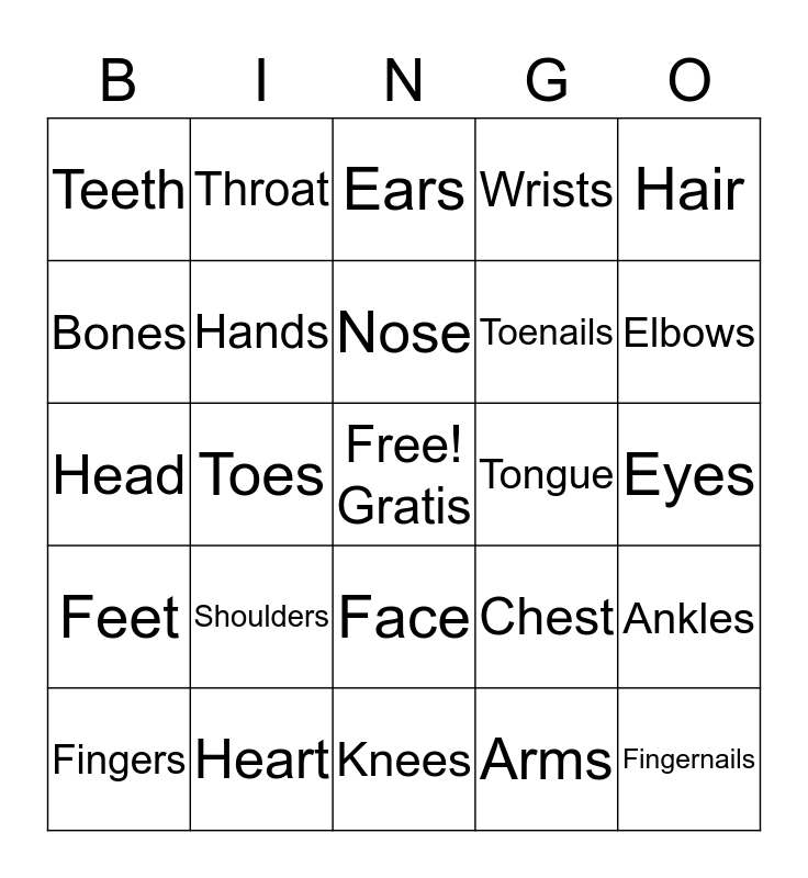 This bingo card has a free space and 24 words: Fingers, Shoulders, Nose, Arms, Hair, Teeth, Throat, Ears, Tongue, Eyes, Head, Hands, Chest, Ankles, Bones, Heart, Knees, Wrists, Elbows, Feet, Toes, Face, Toenails and Fingernails.