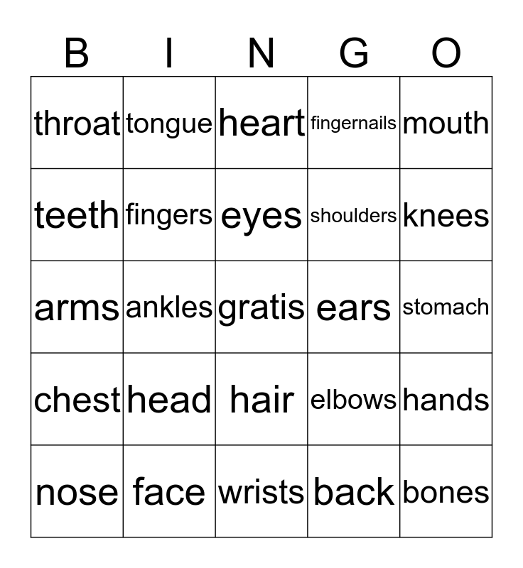This bingo card has a free space and 24 words: head, face, eyes, nose, mouth, throat, teeth, tongue, ears, hair, shoulders, arms, elbows, hands, fingers, back, stomach, heart, knees, ankles, bones, chest, fingernails and wrists.