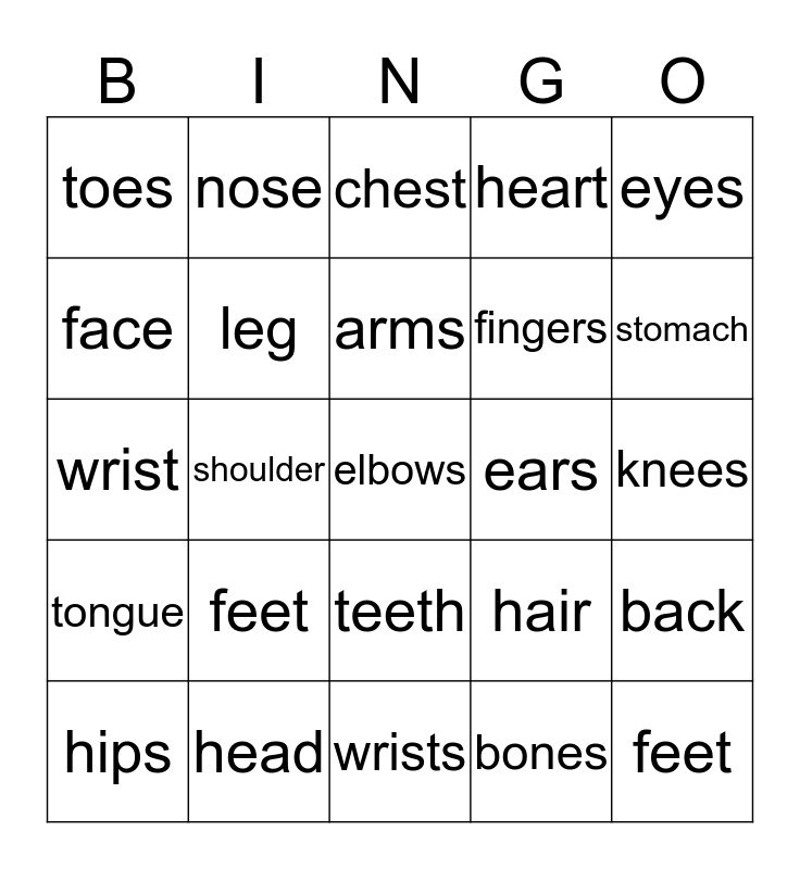 This bingo card has a free space and 24 words: feet, head, arms, hips, eyes, toes, face, nose, ears, teeth, fingers, wrist, hair, back, leg, bones, knees, chest, stomach, shoulder, feet, tongue, heart and wrists.