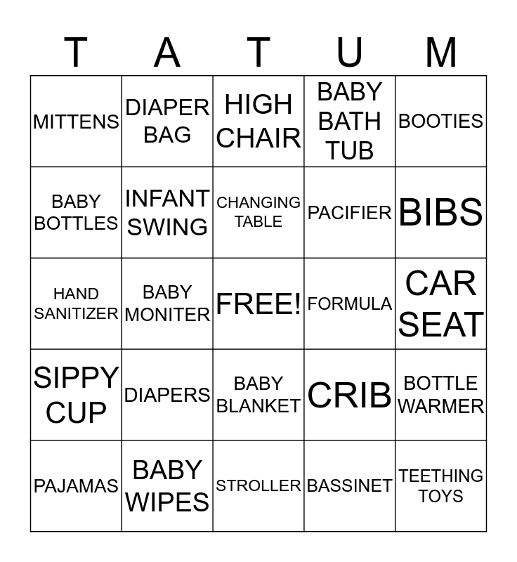 This bingo card has a free space and 24 words: DIAPERS, BABY WIPES, CHANGING TABLE, PAJAMAS, BOOTIES, MITTENS, BABY BOTTLES, DIAPER BAG, FORMULA, BABY BLANKET, PACIFIER, HAND SANITIZER, CRIB, BOTTLE WARMER, INFANT SWING, BASSINET, CAR SEAT, HIGH CHAIR, BIBS, BABY MONITER, TEETHING TOYS, SIPPY CUP, BABY BATH TUB and STROLLER.