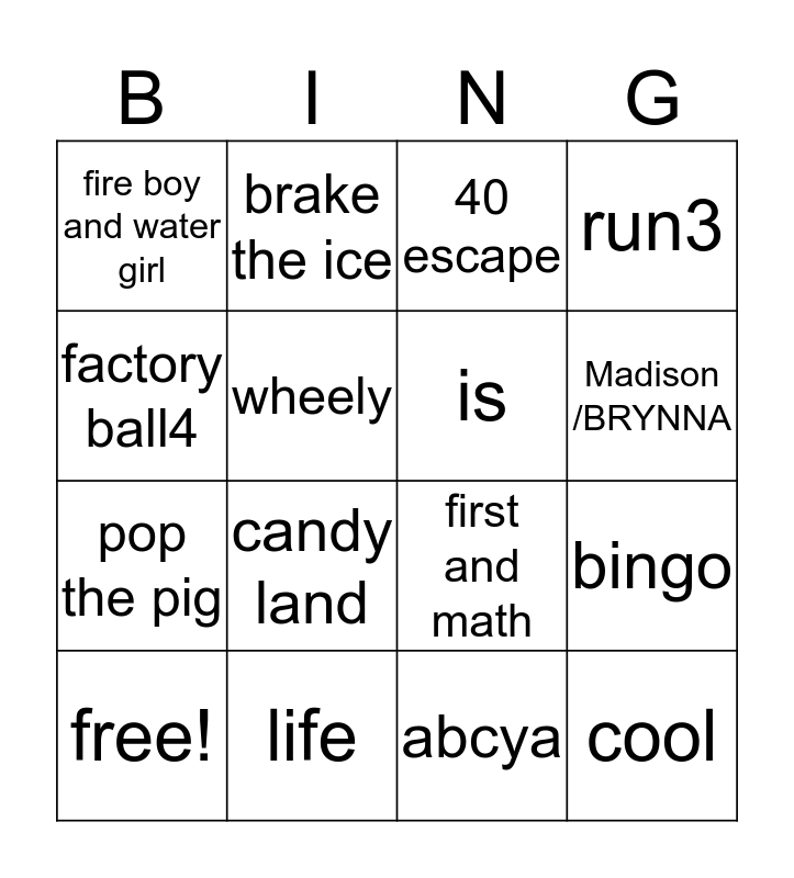 This bingo card has 16 words: life, bingo, 40 escape, fire boy and water girl, pop the pig, brake the ice, first and math, abcya, factory ball4, wheely, free!, run3, candy land, Madison /BRYNNA, is and cool.