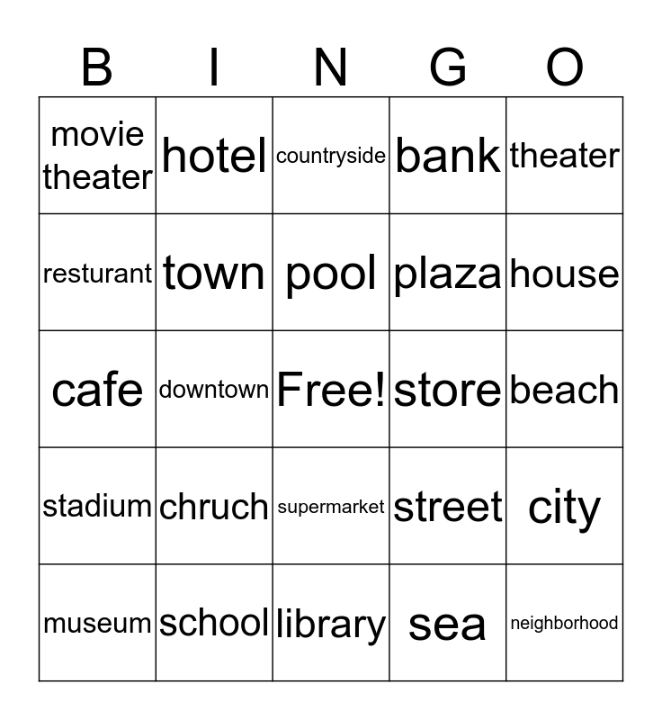 This bingo card has a free space and 24 words: chruch, school, pool, museum, theater, movie theater, resturant, hotel, store, supermarket, plaza, cafe, street, city, town, sea, beach, countryside, house, downtown, neighborhood, stadium, bank and library.