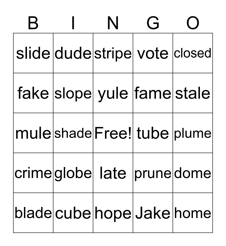 This bingo card has a free space and 29 words: blade, grapes, shade, glide, slide, stripe, slope, globe, tube, cube, plume, home, hope, Jake, stale, extreme, late, crime, closed, mule, prune, tube, fame, fake, vote, dude, dome, yule and frame.