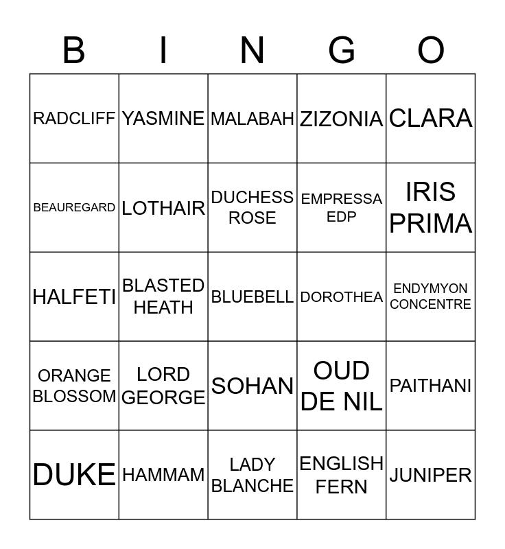 This bingo card has 25 words: LORD GEORGE, LADY BLANCHE, DUCHESS ROSE, DUKE, CLARA, RADCLIFF, BEAUREGARD, YASMINE, DOROTHEA, SOHAN, EMPRESSA EDP, HALFETI, OUD DE NIL, PAITHANI, LOTHAIR, JUNIPER, ENDYMYON CONCENTRE, MALABAH, IRIS PRIMA, BLASTED HEATH, BLUEBELL, HAMMAM, ORANGE BLOSSOM, ZIZONIA and ENGLISH FERN.