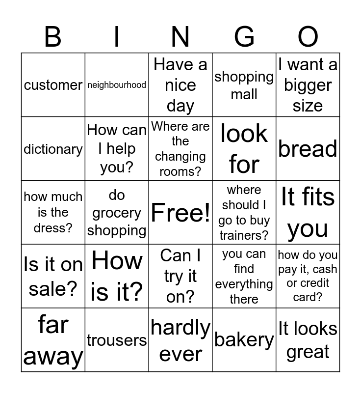 This bingo card has a free space and 41 words: what size are you?, how much is the dress?, what colour do you want?, How can I help you?, trousers, Can I try it on?, Where are the changing rooms?, here you are, I want a bigger size, Is it on sale?, do grocery shopping, shopping mall, It looks great, It fits you, where should I go to buy trainers?, How is it?, salesperson, customer, Take it easy, Have a nice day, how do you pay it, cash or credit card?, how often do you go to swimming course?, hardly ever, look for, magazine, butcher's, bakery, pharmacy, bread, at the corner, newsagent, neighbourhood, far away, don't worry, you can find everything there, dictionary, municipal office, meet friends, pay bills, weekend and weekday.