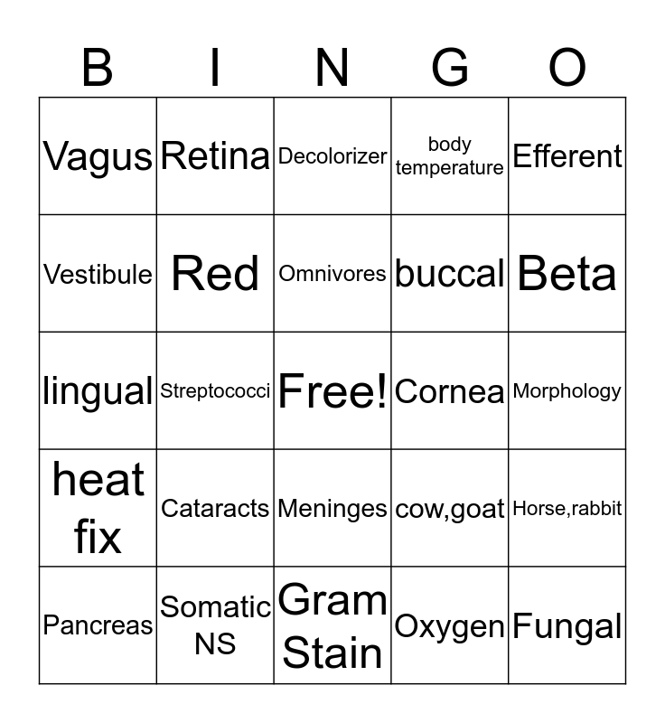 This bingo card has a free space and 24 words: Cataracts, Somatic NS, Omnivores, Pancreas, Efferent, Vagus, Vestibule, Retina, Cornea, Meninges, buccal, lingual, cow,goat, Horse,rabbit, Red, Oxygen, Morphology, Decolorizer, Beta, Streptococci, Fungal, heat fix, body temperature and Gram Stain.