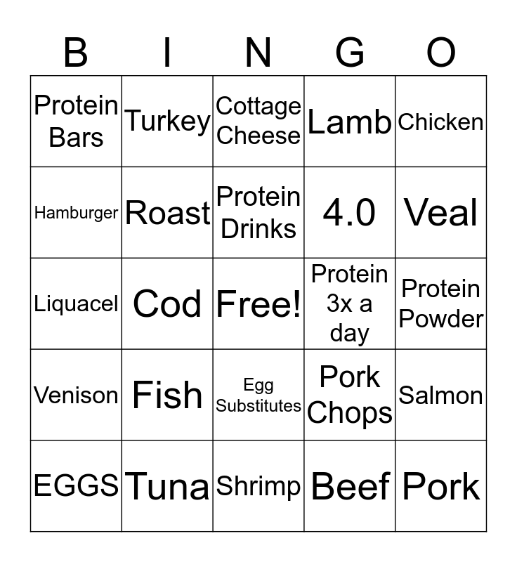This bingo card has a free space and 24 words: EGGS, Fish, Protein Drinks, Beef, Chicken, Protein Bars, Turkey, Cottage Cheese, Protein 3x a day, Protein Powder, Liquacel, Roast, Pork Chops, Salmon, Hamburger, Tuna, Shrimp, Lamb, Veal, Venison, Cod, Egg Substitutes, 4.0 and Pork.