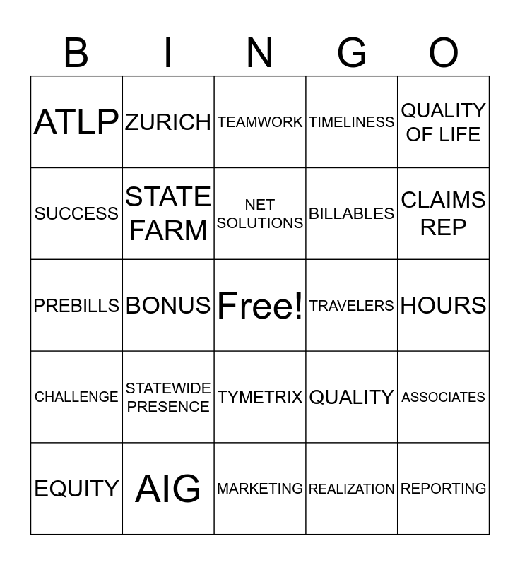 This bingo card has a free space and 24 words: STATEWIDE PRESENCE, AIG, NET SOLUTIONS, EQUITY, QUALITY OF LIFE, ATLP, SUCCESS, ZURICH, TRAVELERS, TYMETRIX, BILLABLES, PREBILLS, QUALITY, ASSOCIATES, STATE FARM, REALIZATION, HOURS, TEAMWORK, CLAIMS REP, BONUS, REPORTING, CHALLENGE, TIMELINESS and MARKETING.