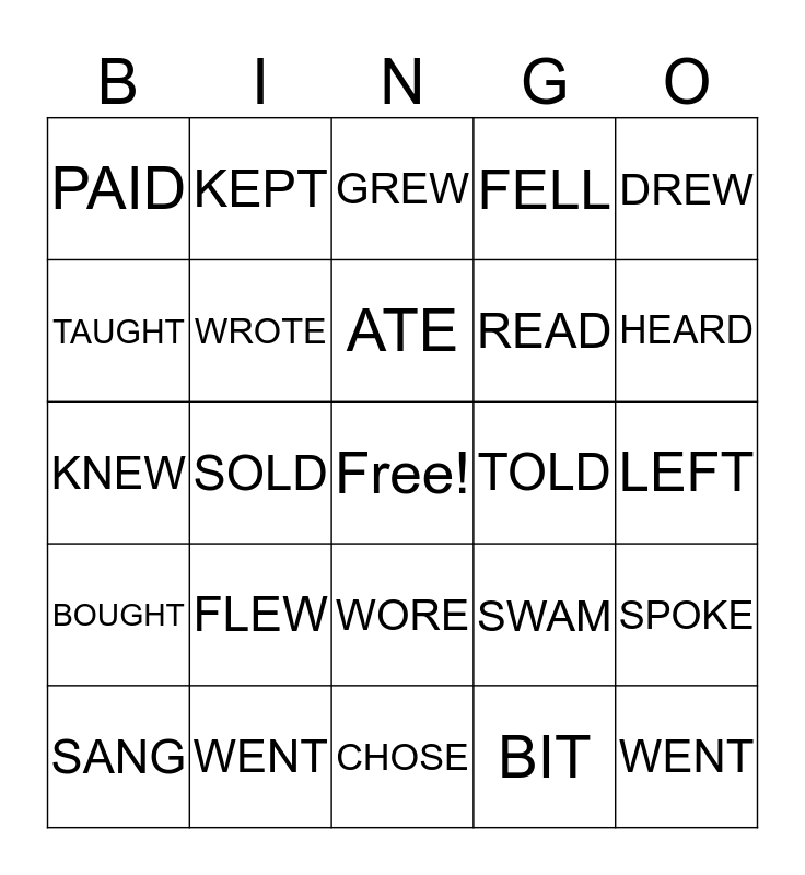 This bingo card has a free space and 24 words: SANG, FLEW, ATE, BIT, DREW, PAID, KEPT, GREW, TOLD, LEFT, KNEW, WROTE, SWAM, SPOKE, TAUGHT, WENT, CHOSE, FELL, HEARD, BOUGHT, SOLD, WORE, READ and WENT.