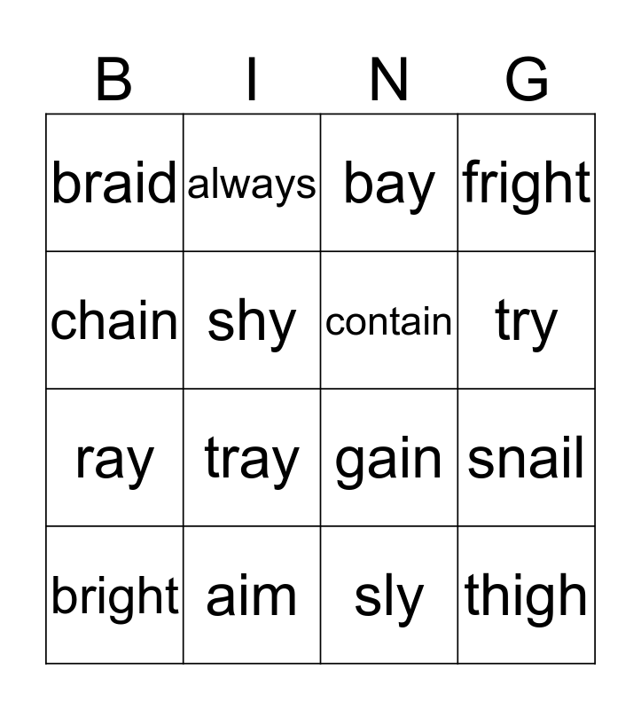 This bingo card has 16 words: aim, snail, bay, braid, ray, always, gain, sly, chain, shy, bright, fright, tray, try, contain and thigh.