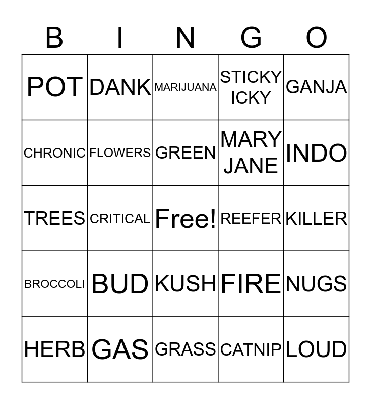 This bingo card has a free space and 25 words: BUD, GRASS, GREEN, HERB, GANJA, POT, CHRONIC, DANK, REEFER, KUSH, MARY JANE, TREES, FIRE, NUGS, FLOWERS, SKUNK, KILLER, MARIJUANA, INDO, CRITICAL, LOUD, GAS, BROCCOLI, STICKY ICKY and CATNIP.