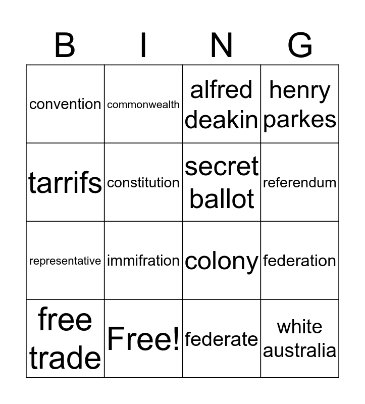 This bingo card has 16 words: Free!, federation, alfred deakin, convention, representative, commonwealth, colony, federate, tarrifs, constitution, free trade, henry parkes, immifration, referendum, secret ballot and white australia.