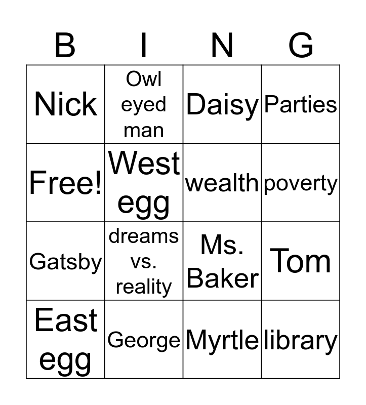 This bingo card has 16 words: George, Tom, Daisy, Nick, Gatsby, Owl eyed man, Ms. Baker, Myrtle, Free!, West egg, East egg, Parties, dreams vs. reality, poverty, wealth and library.