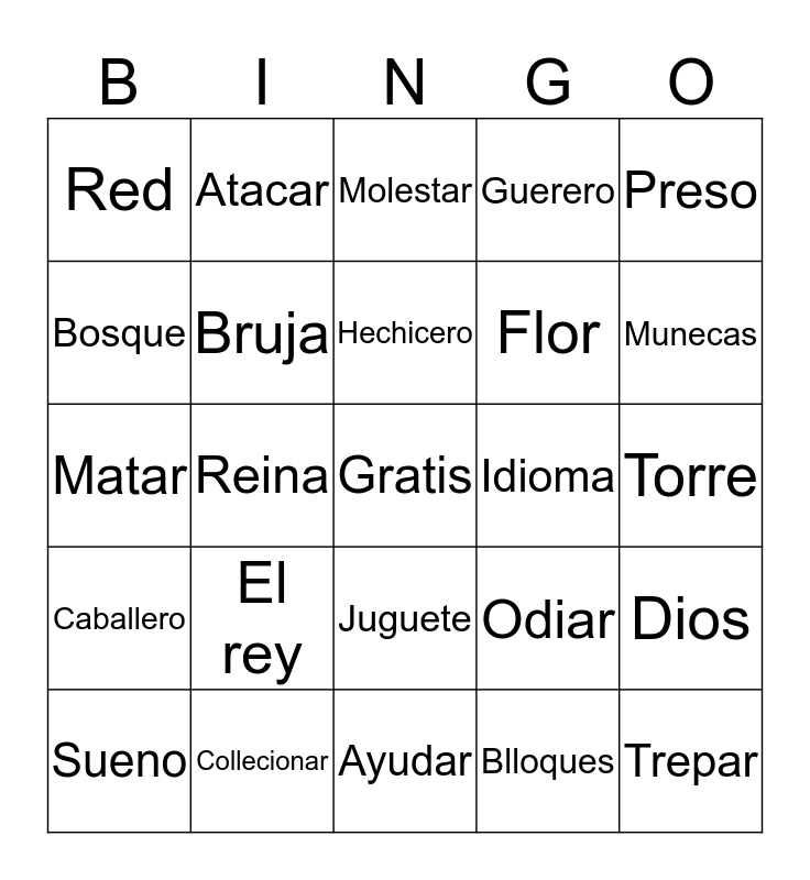 This bingo card has a free space and 24 words: El rey, Collecionar, Hechicero, Sueno, Preso, Red, Bosque, Atacar, Idioma, Juguete, Flor, Matar, Odiar, Dios, Bruja, Blloques, Torre, Molestar, Munecas, Reina, Trepar, Caballero, Guerero and Ayudar.