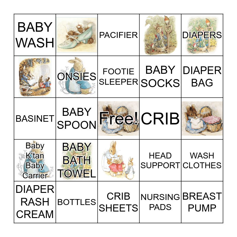 This bingo card has 11 images, a free space and 23 words: CAR SEAT, BOTTLES, PACIFIER, BOOTIES, DIAPERS, BABY WASH, ONSIES, FOOTIE SLEEPER, CRIB, WASH CLOTHES, DIAPER RASH CREAM, BABY SPOON, NURSING PADS, BREAST PUMP, BASINET, KOALA BABY CANVAS CLOSET SET, CRIB SHEETS, HEAD SUPPORT, DIAPER BAG, Baby K'tan Baby Carrier, BABY BATH TOWEL, SWADDLE BLANKET and BABY SOCKS.