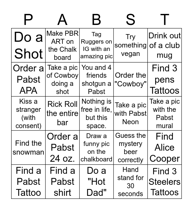 This bingo card has a free space and 24 words: Order a Pabst 24 oz., Find a Pabst shirt, You and 4 friends shotgun a Pabst, Find a Pabst Tattoo, Drink out of a club mug, Do a Shot, Order a Pabst APA, Make PBR ART on the Chalk board, Take a pic with Pabst Neon, Draw a funny pic on the chalkboard, Order the "Cowboy", Kiss a stranger (with consent), Guess the mystery beer correctly, Find Alice Cooper, Take a pic of Cowboy doing a shot, Hand stand for 30 seconds, Take a pic with the Pabst mural, Tag Ruggers on IG with an amazing pic, Find 3 pens Tattoos, Rick Roll the entire bar, Find 3 Steelers Tattoos, Find the snowman, Try something vegan and Do a "Hot Dad".