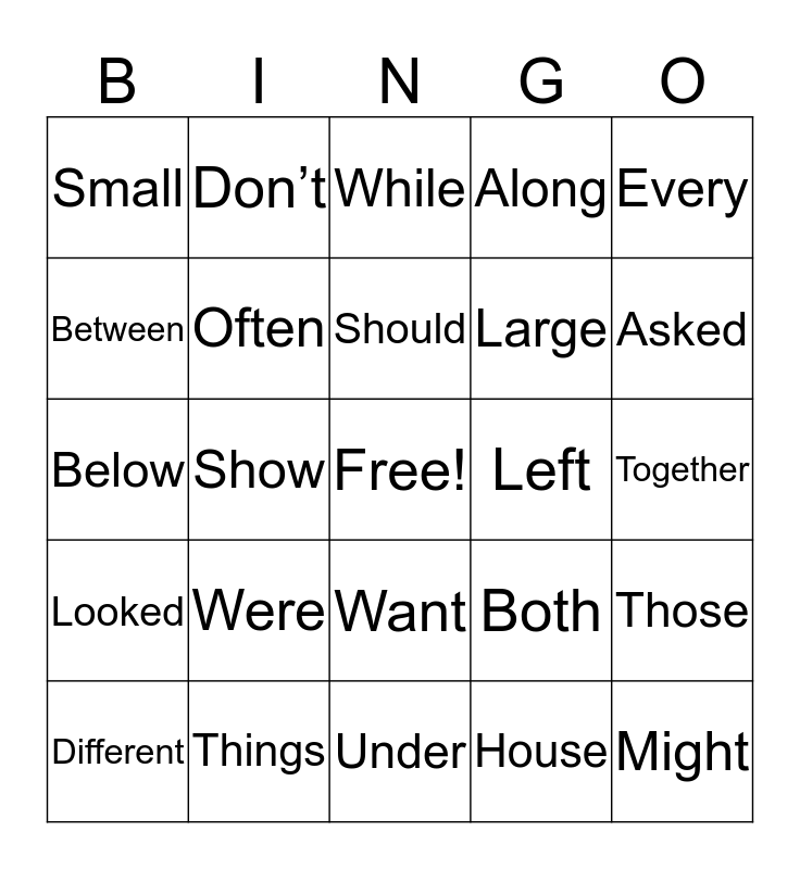 This bingo card has a free space and 24 words: Were, Things, Should, Different, Every, Small, Between, Don’t, Left, Want, Large, Below, Both, Those, Often, House, Together, While, Asked, Show, Might, Looked, Along and Under.