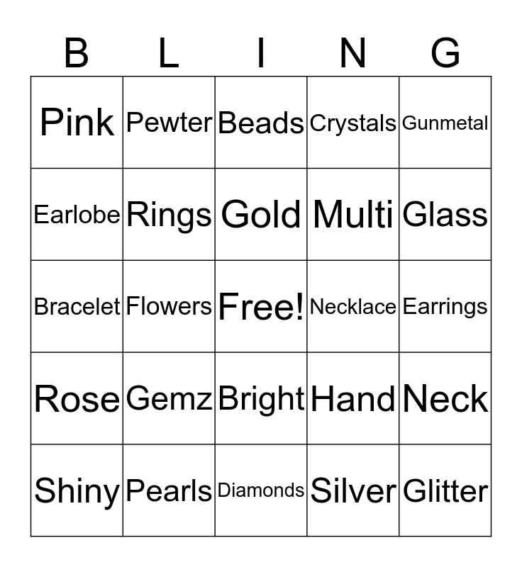 This bingo card has a free space and 24 words: Shiny, Gemz, Gold, Silver, Gunmetal, Pink, Pewter, Beads, Necklace, Earrings, Bracelet, Rings, Hand, Neck, Earlobe, Pearls, Diamonds, Crystals, Glass, Rose, Flowers, Bright, Multi and Glitter.